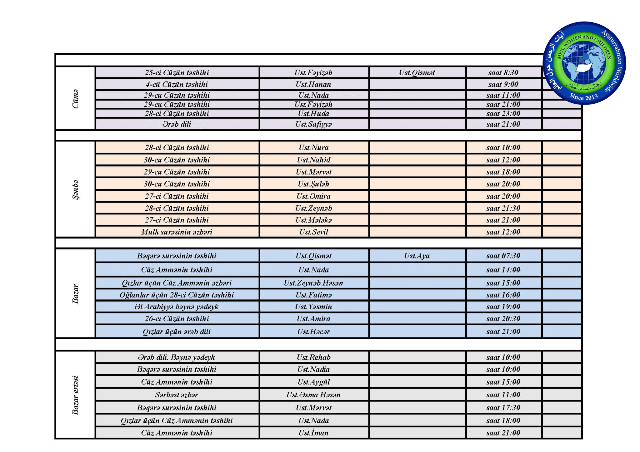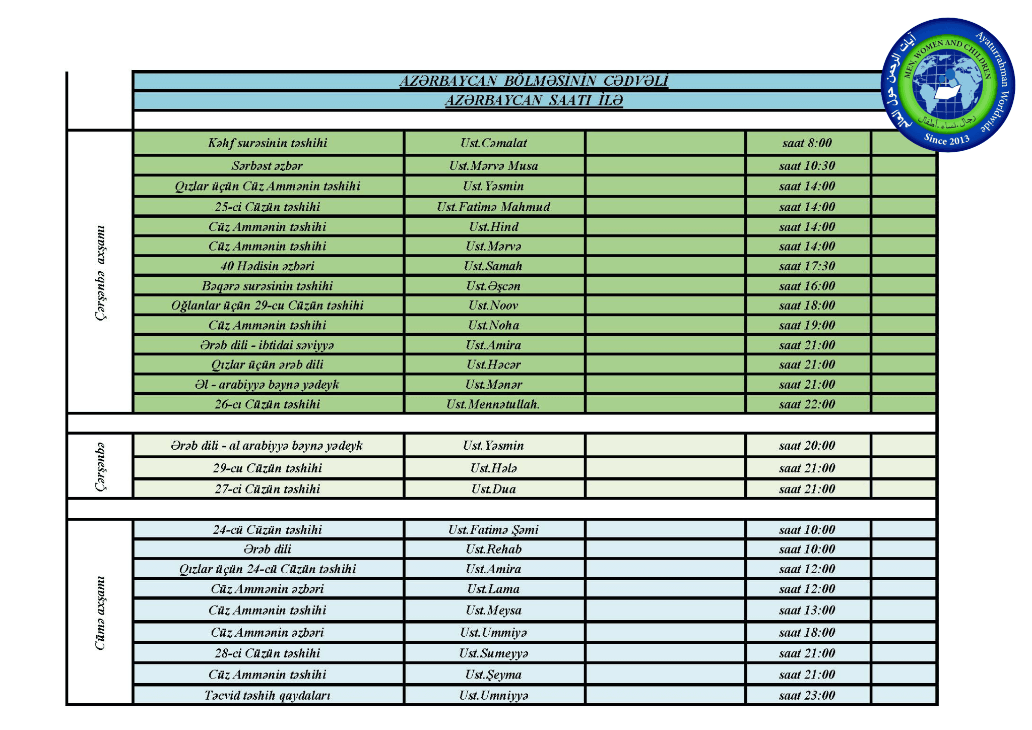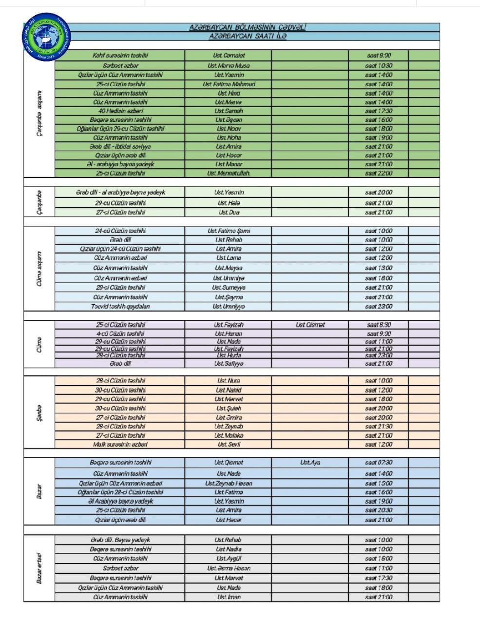 Allahın izni ilə 2020-ci ilin may ayında Azərbaycan bölməsi qurulub və biz tələbələrə qadınlar və uşaqlar üçün Qurani Kərimin cüzlərinin qiraətini (oxunuşunu) və əzbərini düzəltmək üçün kurslar təqdim edirik. Həmçinin ərəb dili dərsləri və yeni başlayanlar üçün ərəb dili hərflərini öyrətmək üçün dərslər.